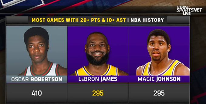 赛后,转播方给出了NBA历史上单场至少20分10助攻次数最多的球员: